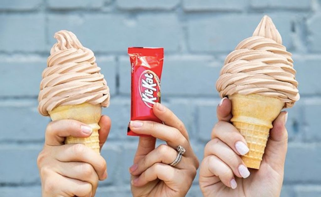 The Kit Kat Soft Serve is exactly what it sounds like, soft serve blended up with actual Kit Kats to creamy perfection — while the Kit Kat Scooped is a hard ice cream that promises bits of real Kit Kat in every bite. The Sundae Dasher features "layer upon layer of Kit Kat pieces, fudge, and Kit Kat soft serve ice cream all topped with whipped cream", according to the company, which makes it the winner in my book. And, of course, the Kit Kat Shake is all of that creamy Kit Kat goodness you could want, in drink form.