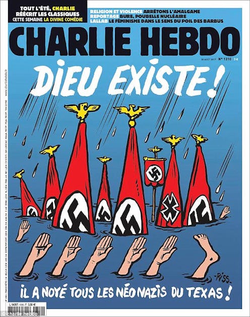 French satirical magazine Charlie Hebdo is not new to controversy. The publication frequently pokes fun at current events, and when those events are tragic, its writers and cartoonists toe the line between commentary and distasteful ridicule. This week, the new Charlie Hebdo cover depicts Texans as neo-Nazis, appearing to satirize their death by Hurricane Harvey.