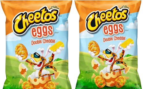 Around Easter it's easy to feel like anything that could possibly be squished into the shape of a chick or an egg or a rabbit is squished into a shape of a chick or an egg or a rabbit. Candy, chocolate, ice cream, and every other confection you can think of is twisted into knots as they push the limit of what can be Easter-ed. But this, this shows some real outside-of-the-box thinking — because now, we have Cheetos Double Cheddar Egg Puffs. Yup, Cheetos — the snack food that you probably never dreamed you would associate with hopping bunnies — has gotten in on the Easter game. It's not what we expected to be seeing, but here we are.
