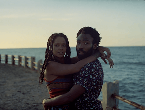 But there was also a romantic element to the film. At another point in Guava Island, Rihanna looks on as Gambino's character playfully performs his song "Summertime Magic" for her while they're on the beach and the moment has seemingly given fans all the feels.