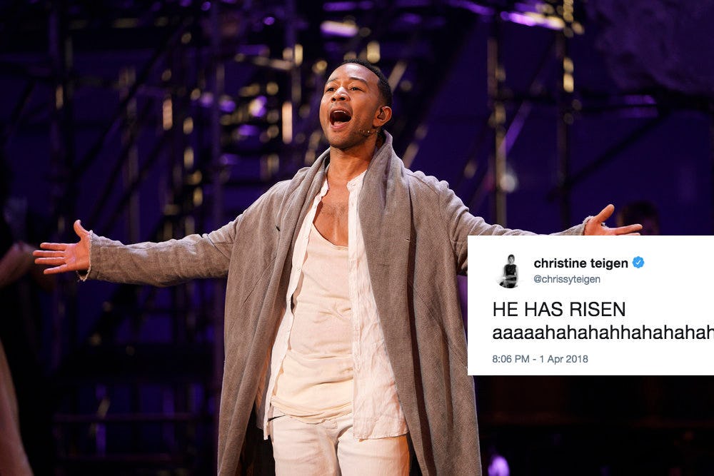 And the day of the broadcast itself was far from the first time Teigen has spoken about her husband's turn as Jesus Christ in the TV adaptation of the iconic musical. In the week leading up to the event, she shared some behind-the-scenes photos of Legend and their daughter, Luna, hanging out in between rehearsals. She also tweeted that she was #cooking4jesus along with several photos of some impressive blackened salmon and salad she was apparently preparing for Legend. She also poked fun at his onstage interactions with his costars, tweeting, "who's this chick he's giving bread to?" in response to a rehearsal photo.
