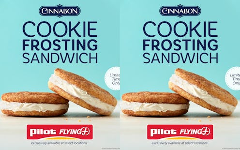 The Cinnabon Cookie Frosting Sandwich is available for a limited time exclusively at Pilot Flying J, so if you were planning a road trip, right the heck now is the time. Per a press release, the confection is "[m]ade with two snickerdoodle cookies infused with Cinnabon cinnamon roll flavor and rolled in cinnamon sugar," then "held together with Cinnabon’s signature cream cheese frosting filling." As someone who is also held together with Cinnabon's signature cream cheese frosting filling, I am honored to at last feel seen and represented by a chain restaurant's dessert.