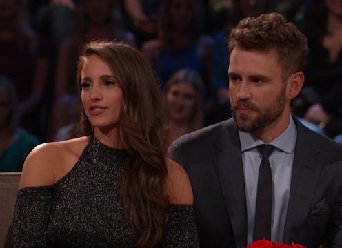 On this episode of Will You Accept This Podcast? (which you can listen to here), Bustle’s Senior Entertainment Editor Kelsea Stahler and Romper's Senior News and Entertainment Editor Allison Piwowarski discussed Nick and Vanessa as a couple and are unsure what to make of it. While both hosts are happy Nick finally found love on the show, they can't help but notice they've been awkwardly dancing around the topic of marriage and haven't appeared totally happy. Not to mention, Kelsea thinks that their body language and facial expressions during their post-Bachelor interviews has also been very telling.