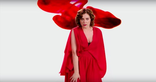 In it, she stands in an appropriately flowy red dress against a series of shifting red backdrops. She juxtaposes scenes from previous episodes with her own lyrics, including glorious lines like "Think of it as Mother Nature's juice clams" and "If you're grossed out, let's pretend it's cherry lube."