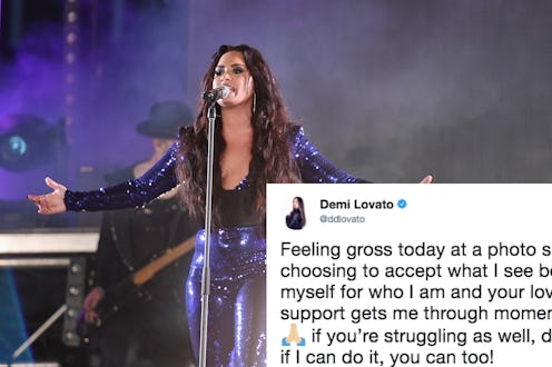 Unrealistic and dangerous beauty ideals thrust upon women are a one-way street to low self-esteem and food-shaming, and one singer/songwriter has had enough. Demi Lovato's tweets about food shaming are empowering AF, and send a clear message that while the struggle is real, food-shaming yourself or others is not OK. Lovato has been vocal about overcoming her eating disorder, and when she admitted to feeling "gross" during a recent photo shoot, she didn't hold back. Because, as Lovato knows all too well, internalizing negative body-image ideals can make you sick.
