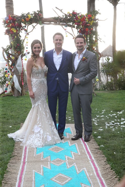 According to E! News, both the bride and groom's wedding rings were designed by Neil Lane. Since he also supplies the show's engagement rings, it's likely he either donated the wedding rings or ABC footed the bill. E! News reported that Evan's white platinum band retails for an estimated $1,200 to $1,500, while Carly's wedding ring reportedly retails for $50,000. That's a pretty hefty price tag for Carly and Evan to take care of themselves (especially for only one aspect of the big day) — further adding to the speculation that ABC may have stepped in to help with costs.