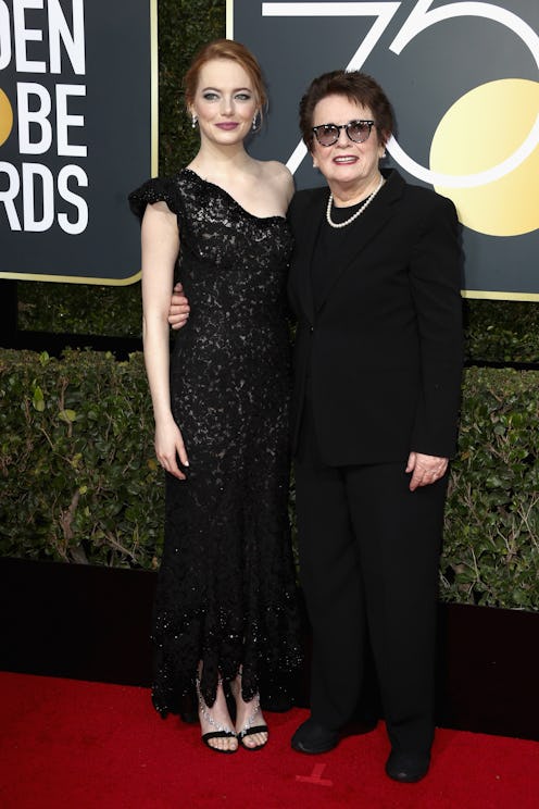 Awards season is officially here, and it's starting out with a bang. Looking perfectly on-theme, Emma Stone wore all black to the Golden Globe Awards and took Billie Jean King as her date. The actor has a way of merging her characters and personalty into one outfit, but this year she took it to a whole new level. Because being nominated for Best Actress in a Musical or Comedy Motion Picture for her role in Battle Of The Sexes is great, but she giving the spotlight to the real-life star behind her nominated role.
