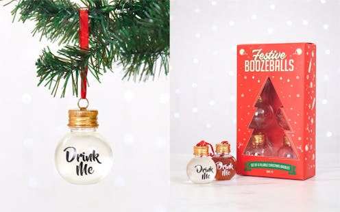 The boozy ornaments don't come pre-boozed, but are small, clear ornaments with tops that you can remove and fill with liquid. They're also printed with "Drink Me" on the side. Really, you could put anything in there — Kool-Aid, confetti, a tiny rolled-up letter that you then set out to sea — but the purpose is meant to be liquor, so that you can take a shot right off of your Christmas tree. After all, it's the only time of the year where taking a shot right off your Christmas tree can even be a thing.