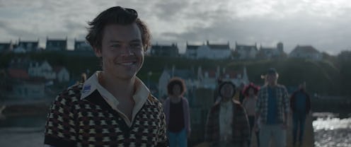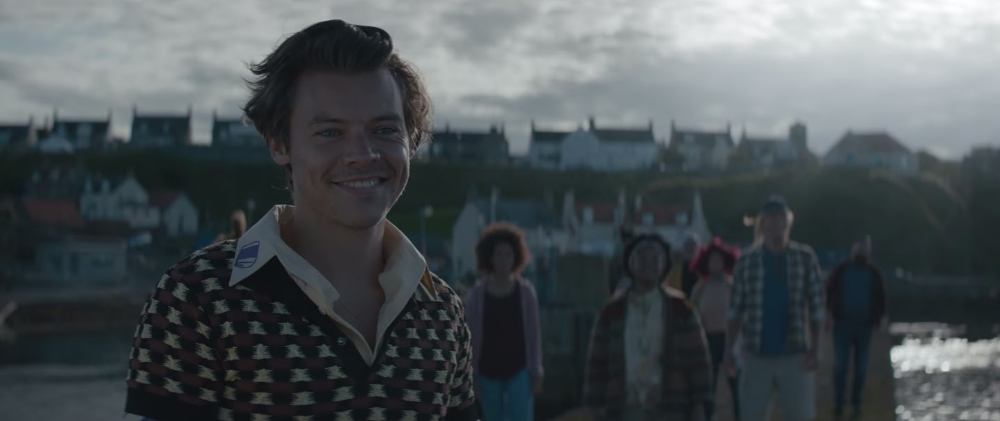 "Adore You" opens with a narrator, who introduces the island. Located in between Belfast and Glasgow, Eruda is far from the dream island life. Styles stars as an Erodian who was born with a blinding smile, much to the dismay of the islanders, whose moods matched the perpetually gray skies. Instead of being happy and bright, the island is grey, and citizens aren't overly friendly. And Spanish artist Rosalía acts as an off-screen tour guide, detailing the various superstitions of Eroda that posed ill omens: the sight of a "minister in the morning," the sound of mentioning a "pig in a fisherman's pub," and the touch of "whistling in the wind." (Think Moonrise Kingdom and The Life Aquatic, or your other favorite Wes Anderson movie.)