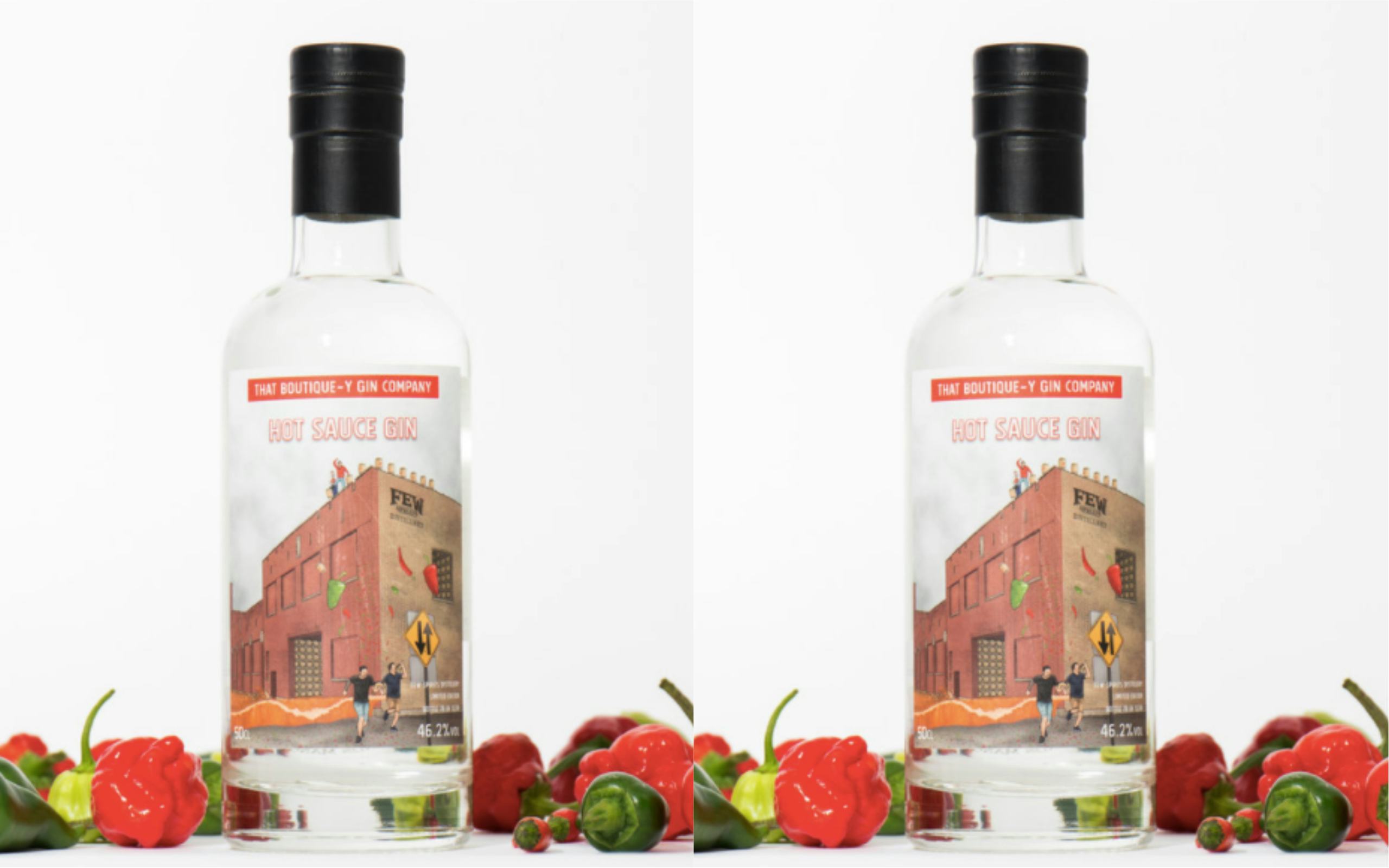 Even the label of the Hot Sauce Gin is a work of art, depicting "FEW [Spirits'] Paul Hletko and Maverick Drinks' Michael Vachon kicking barrels off of a roof and pelting Atom Brands' Ben Ellefsen and Nick Ravelhall with peppers as they're chased by a wave of bourbon." Talk about intense.