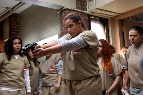 While Daya isn't a huge part of the subsequent conflict between the Dominican women and the rest of the prison, she does join Maria's gang and starts working in the salon where they are dealing drugs. Daya, depressed, still reeling from the loss of both her baby and his father, the still-missing CO Bennett, doesn't listen to her mother's pleas to stay away from the group and avoid possibly being caught around drugs, as the prison begins racially profiling women of color and searching them more frequently. Aleida gets to leave the prison, but is unable to find or take care of Daya's baby or any of her own children because of the rules of post-release. This means that when the season ends, she's on the outside, watching the conflict at Litchfield on television, rather than behind bars. So when Daya picks up the gun, she is sad, alienated, and without her mother or any stronger, older figure in her life.