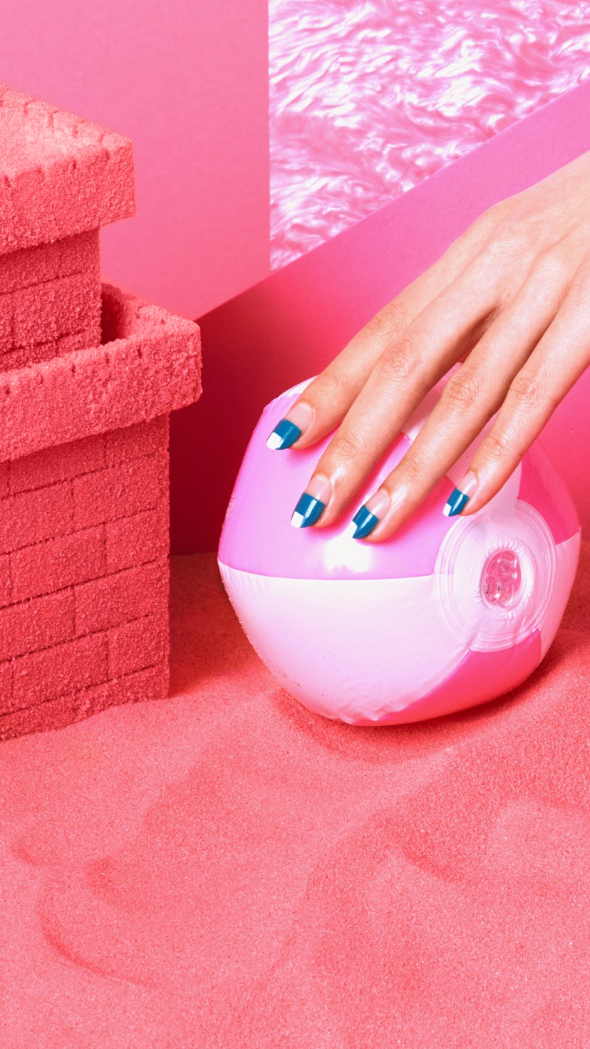 This graphic manicure is as much a bold, summery fashion accessory as oversize cat-eye sunglasses or rainbow tassel sandals. First, use a striping brush to paint a thin, dark teal line across the center of the nail. Switch to the polish brush to fill in the top half of the nail. Once that dries, paint a small box at the center tip of each nail in a classic white shade. "If you don’t think you can swing it with the striping brush, you can use striping tape to tape off and then fill in the sections," says Torello. Then complete the look with a layer of top coat for a long-lasting, glossy finish.