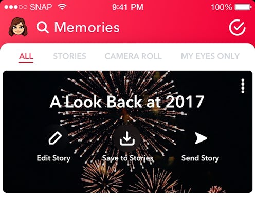 Right at the top of the “All” tab on the Memories screen, you should see a big ol’ rectangle showing a night sky with some fireworks and the words “A Look Back At 2017” emblazoned across it. This is your 2017 Story. Congratulations! You’ve found it. From here, you can do whatever you like with it by tapping any of the three options available for it: You can Edit your 2017 Story, Save it to your main Stories roll, or Send it to friends like you would any other Story.
