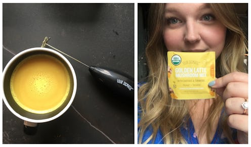Almost every afternoon for the past month or so, I've been drinking a steaming hot mug of mushroom juice. Well, sort of. The technical name of the beverage is Four Sigmatic's Golden Latte Mushroom Mix, a blend of shiitake mushrooms and turmeric that claims to generally "beautify" your skin. Other ingredients in the blend include coconut milk powder, coconut palm sugar, ginger powder, tulsi powder, black pepper powder, and Reb A (a stevia extract) — all organic, of course. According to the Four Sigmatic website, the powder supports a "glow-from-within" and general skin health. It goes on to describes it as literally "your own personal airbrush tool."