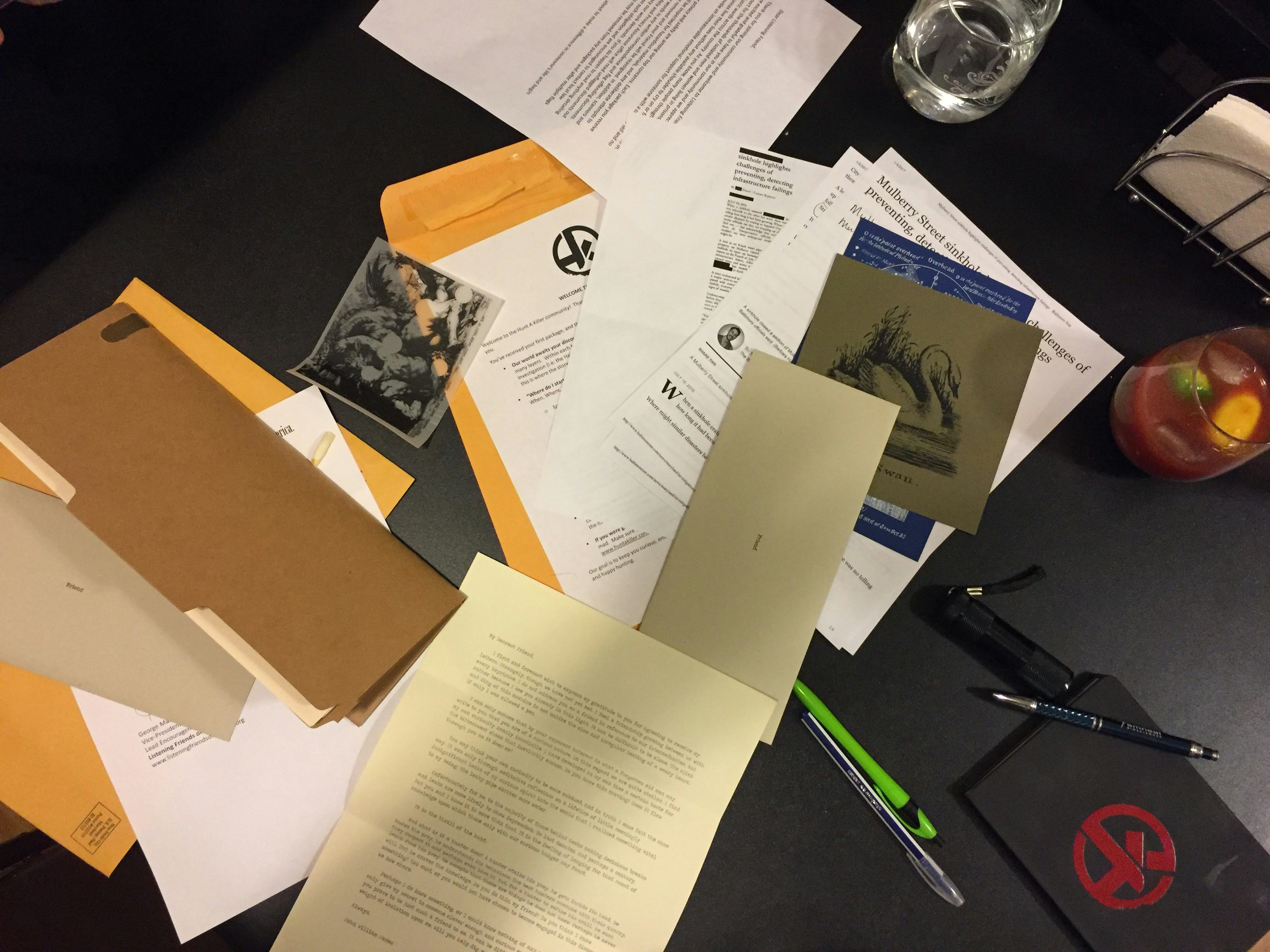 We spread the evidence out on a table in Sam's kitchen, glasses of Bloody Mary in hand (because, get it? Murder party, Bloody Mary? We're hilarious, definitely invite us to your parties). An article with the source redacted stuck out the most, in addition to a sealed envelope, a picture of a swan, a constellation map, and an introduction letter to a program we have apparently been signed up for as part of the game: Listening Friends of America. Apparently, in the Hunt a Killer universe, we have signed up for this service that matches us up with an inmate at a state prison in Maryland, and that inmate is able to send us letters as a friend. Our inmate? John William James, someone who refers to us lovingly as "Friend" in his letter and also says creepy stuff about "the thrill of the hunt" and leaky pipes carrying more water. I comment that I'm pretty sure he did whatever it is that we're investigating, but obviously, there is more evidence to sift through before we can make that call.
