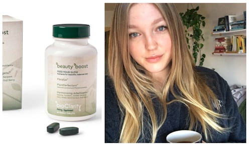 According to the bioClarity website, Beauty Boost uses a variety of vitamins (A, B6, C, D, E, and K to be exact) to "feed your glow" — or, in other words, supposedly supports the formation of Vitamin A, hyaluronic acid, elastin, and collagen in your skin. The supplement also uses all of the above in combination with ingredients like matcha, goji berry, grape seed, turmeric, and golden-serpent fern to "calm and protect" skin. One bottle of Beauty Boost goes for $32.95 and includes 30 days worth of tablets. You're supposed to take two of them twice a day — once in the morning, and once at night.