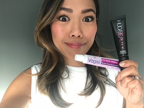 Inspiration can come from the most unexpected places, especially when it comes to beauty products. Take Benefit, for example, who looked to space suits and spaceships when they were creating their latest aeroparticle-packed BADgal Bang! mascara. Or how about when Jen Atkin had the brilliant idea to create Ouai's Dry shampoo foam after one of her followers, a nurse, told her about a no-rinse foam cleanser they use at hospitals for patients. The latest unusual backstory for a new beauty product might take the cake, though — Huda Kattan's new Complexion Perfection Pre-Makeup Base was inspired by Vagisil. Yes, Vagisil — the very same cream you can find at your local pharmacy to treat vaginal irritation.