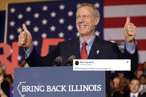 I had high hopes for 2018, but after checking my Twitter feed last night, I'm ready for next year. In one of the most truly inexplicable stunts I've ever seen, Illinois Governor Bruce Rauner drank chocolate milk in the name of diversity, and Twitter had some questions. Can you blame them? According to The Chicago Tribune, the governor was attending a Black History Month event Wednesday when he was invited onstage by Tyronne Stoudemire, vice president of global diversity and inclusion at Hyatt Hotels. Stoudemire, who is Black, pours milk into a glass and says it represents the lack of diversity in Fortune 500 companies. "If you look at any corporate website and look at its leadership team, you'll see all white men, a few white women and just maybe an Asian in technology," Stoudemire says. It's worth noting that Stoudemire has been performing this demonstration for 16 years, according to the Tribune.