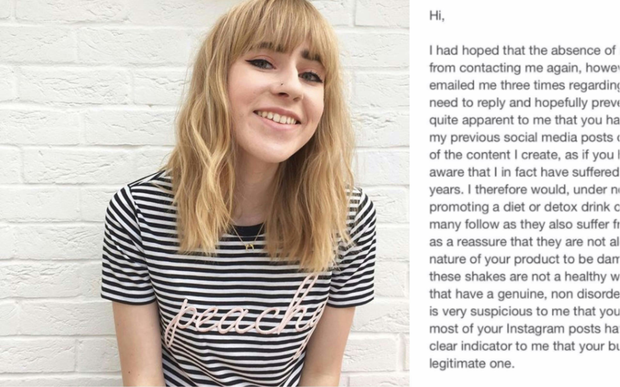 "I therefore would, under no circumstance, even consider promoting a diet or detox drink on my social channels, which many follow as they also suffer from mental health issues and use as a reassure [sic] that they are not alone in these struggles. I find the nature of your product to be damaging, and I know for a fact that these shakes are not a healthy way to lose weight, even for those that have a genuine, non disordered [sic] desire to do so."