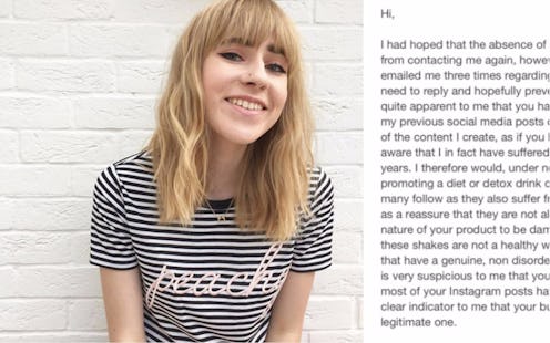 It's no secret that diet companies with, er, questionable claims lurk in every corner of the Internet. Dropping to a size two is as easy as consuming their product with every meal — or so they say. On Saturday, fashion student and Instagram influencer Charlotte Rollin called out a diet shake company on Twitter for contacting her one too many times about becoming their brand ambassador. Her problem with the Choco Diet went deeper than an influx of emails. Rollin, you see, has struggled with disordered eating for five years, and she believes that diet drinks are unhealthy, making the offer for a partnership especially tone-deaf. Bustle has reached out to the Choco Diet for comment and will update when we hear back.