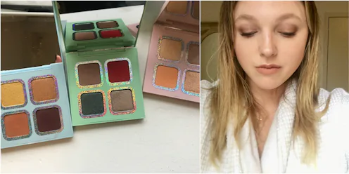 The eyeshadow quads are all pastel shades with holographic lettering, and the lipsticks feature different pastel-toned metallic detailing. It's all very millennial and very fun. Another kind of cool feature of the makeup packaging is that it's all fairly heavy; it feels nice sitting in your hand while you swipe on eyeshadow, or when you pick up a tube to apply lipstick. At $28 for a shadow set (or $7 per single eyeshadow shade) and $17 for each lipstick, these items are on the mid-to-high prince range when it comes to makeup. But the price isn't just reflected in the packaging; it's also very clear when you test out the products themselves.