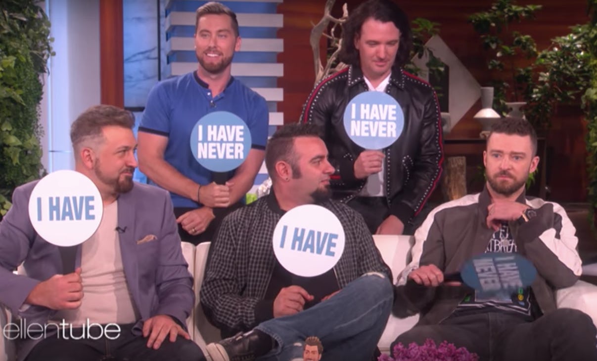 Ellen DeGeneres put some pretty high stakes on this game, letting them know before it even began, "Answer [the questions] honestly, or there will be consequences." Clearly, that was enough to get the guys talking about whether they've ever hooked up with someone twice their age (Fatone and Kirkpatrick had), or if they ever hooked up with a Spice Girl. To that question, Timberlake stroked his chin and took a long time to answer, only to have DeGeneres hold up the "I Have" sign for him. It seems DeGeneres might have known something about her good friend JT before asking that specific question. And no, neither of them revealed which Spice Girl it was.