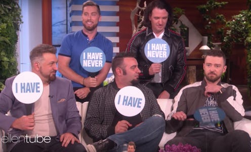Never have you ever seen *NSYNC play the game "Never Have I Ever." Well, until now, that is. On Tuesday, Justin Timberlake and his former boy bandmates — Lance Bass, JC Chasez, Joey Fatone, and Chris Kirkpatrick — made a surprise appearance on The Ellen DeGeneres Show where they talked about *NSYNC receiving a star on the Hollywood Walk of Fame. Oh, and spilled the tea on some of their '90s hijinks, which included Timberlake possibly hooking up with a Spice Girl.