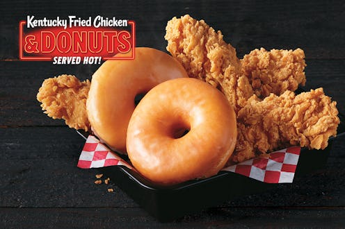 According to a press release provided to Bustle, the Chicken & Donuts test, which began on Sept. 16, actually comprises two items: the Kentucky Fried Chicken & Donut Basket meal, which pairs either chicken on the bone or chicken tenders with one glazed donut (although you can also up the ante and make it a “big basket meal” with two donuts for a couple of extra bucks); and the Kentucky Fried Chicken & Donuts Sandwich, which takes a KFC Extra Crispy breaded chicken filet and slaps it between two glazed donuts. The Chicken & Donut Basket meal is priced at $5.49, with the “big basket” version coming in at $7.49, while the Chicken & Donuts Sandwich comes in at $5.99, or $7.99 as a combo meal.