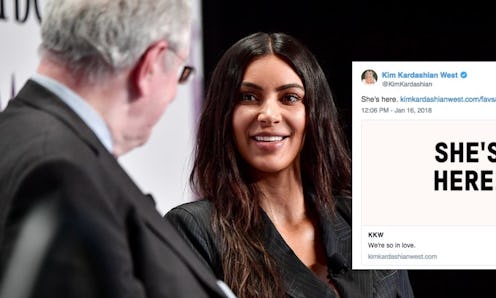 Two simple words mean the growth of a legacy. Kim Kardashian announced the birth of her third child on Tuesday, and fans are already freaking out about the new baby girl. Although Kim hasn't revealed the name, she gave a few brief details on her website about the latest addition to the West family with a light-pink post titled, "SHE'S HERE!" Kim and Kanye's baby announcement reveals the newborn arrived via surrogate early Monday morning and the whole family seems like they're over the moon.