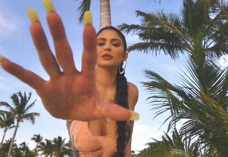 Jenner has been living her best life while on vacation in Turks and Caicos this past week. She posed for a series of photos in a vintage, baby blue Chanel bikini that came out before she was born and has been sharing yacht-side pictures on her feed. She also posted a shot while wearing a lemon-hued swimsuit with cut-outs and branded with the Kylie Skin logo. But it was Jenner's neon yellow and pale pink manicure that was the most memorable thing in the image posted on July 19.