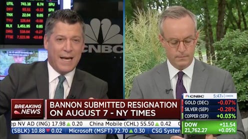 During a "Power Lunch" segment on CNBC discussing The New York Times' scoop that Trump had fired Bannon — Bannon's camp has pushed back on this narrative, insisting that the ex-chief strategist had handed in his resignation to Trump before Charlottesville and the push against white nationalism that followed — the hosts' conversation was interrupted by wild cheering in the background.