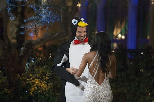 When thinking back to last season of The Bachelor, Corinne Olympios and her cheese pasta stand out in fans' memories. And sure, Vanessa Grimaldi ultimately won Nick Viall's heart. But, in my opinion, no contestant quite stood out like Alexis Waters, who proudly wore a "dolphin" costume (which was later revealed to be a shark). However, it looks like Rachel Lindsay's Bachelorette season may have a contestant who blows Alexis' outfit out of the water. Bachelorette's Matt wears a penguin costume when meeting Rachel — and it looks pretty impressive.