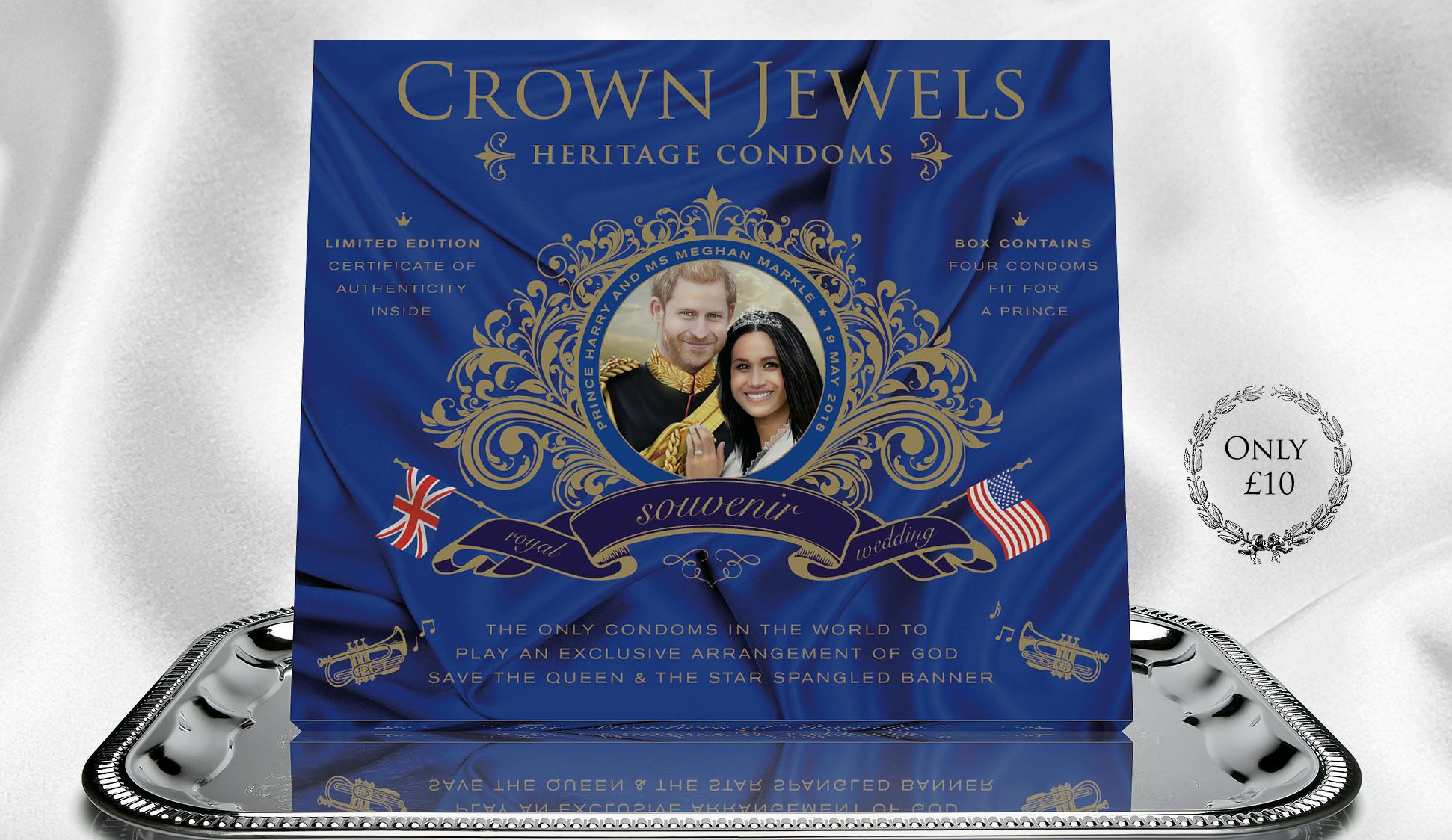In case that doesn't seal the deal, they also play God Save the Queen and the Star Spangled Banner when you open up the package. MUSICAL CONDOMS! Crown Jewels claims they are the "most luxurious royal wedding condoms ever made," leading me to wonder exactly how much competition they have in the royal wedding condom market.