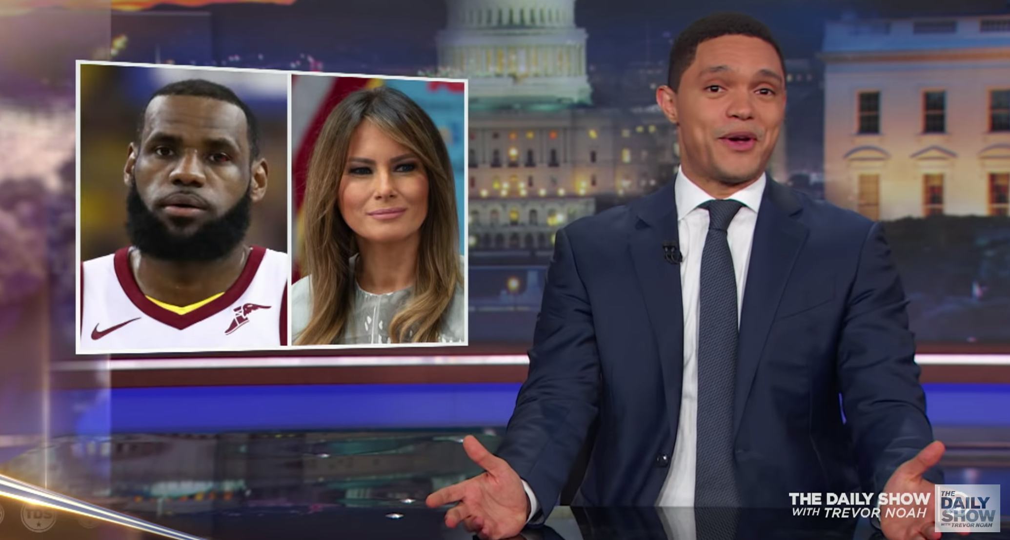 Then he moved to Melania Trump's statement. "What was surprising is who came to LeBron's defense," Noah said. He then listed the times she's come out against her husband: kids at the border in cages, watching CNN on Air Force One, and her photos taken with vegetables.