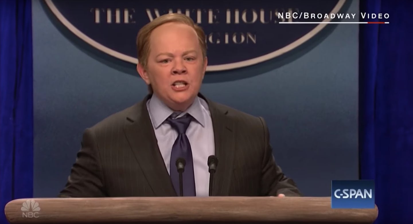 But before you start firing this glorious gem off to all of your friends, some backstory. She's had us living for her spot-on Sean Spicer impression all season, but McCarthy is actually hosting Saturday Night Live on May 13, so it was practically guaranteed that the show was going to take things to the next level. And in this case, "the next level" is apparently cruising through rush hour traffic on a motorized podium in midtown Manhattan. Bless you, Melissa McCarthy, bless you. The exact location was apparently down 58th Street, in front of the CNN building, according to BuzzFeed, and multiple fans captured footage of the hilarious comedian blazing through traffic, yelling at cars to get out of her way. As you do when you're "Spicer" atop a jerry-rigged podium on wheels. This is all perfectly standard.