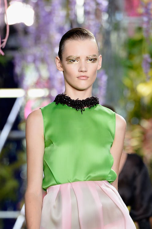 To create your own shimmery eyebrow at home, you can use a slew of different products. If you want a subtle metallic look, try dusting on silver or gold shadow heavy with glitter. But if you want a liquid-like, gilded look similar to the ones you see on the Dior runway, opt for a cream shadow or gold liquid eyeliner. That way you get a heavy dose of pigment.