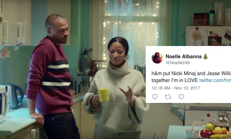 Move over Rainbow and Dre Johnson, there's a new TV couple in town. A 12-second teaser commercial for H&M's holiday 2017 campaign has literally turned Nicki Minaj and Jesse Williams into the internet's new favorite on-screen 'ship. The clothing brand somehow managed to wow fans in less than a quarter of a minute with the new snippet which featured the Barbz in a role that no one had ever seen her in before: a mom. However, it would be the pairing of Minaj and her insanely handsome co-star, Williams, that would have fans gushing over how adorable these two look together.