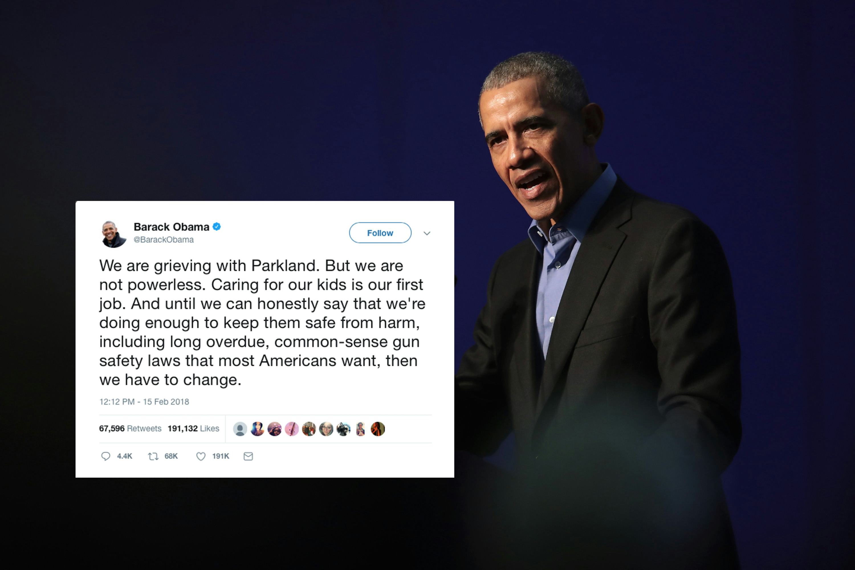 "We are grieving with Parkland. But we are not powerless," Obama tweeted Thursday. "Caring for our kids is our first job. And until we can honestly say that we're doing enough to keep them safe from harm, including long overdue, common-sense gun safety laws that most Americans want, then we have to change."