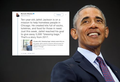 Lastly, Obama took a moment to praise Jahkil Jackson, a 10-year-old who makes and hands out "blessing bags" — kits with toiletries, socks, and food — to homeless people in Chicago. Jackson's parents say that their son has been passionate about helping the homeless since he was 5, and has since distributed over 5,000 blessing bags to Chicago's homeless.