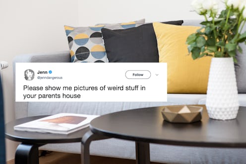 Part of adulting is realizing that not everyone was raised with the same traditions as you, and once that sinks in going home for the holidays can be an eye-opening experience. Twitter user @jenndangerous is acknowledging that the struggle is real, and she post a callout on Twitter for people to post the weirdest stuff they find in their family's house when they go home for the holidays. "Please show me pictures of weird stuff in your parents' house," she tweeted. Because, every family has its idiosyncrasies, and these hilarious tweets prove that you're not alone.
