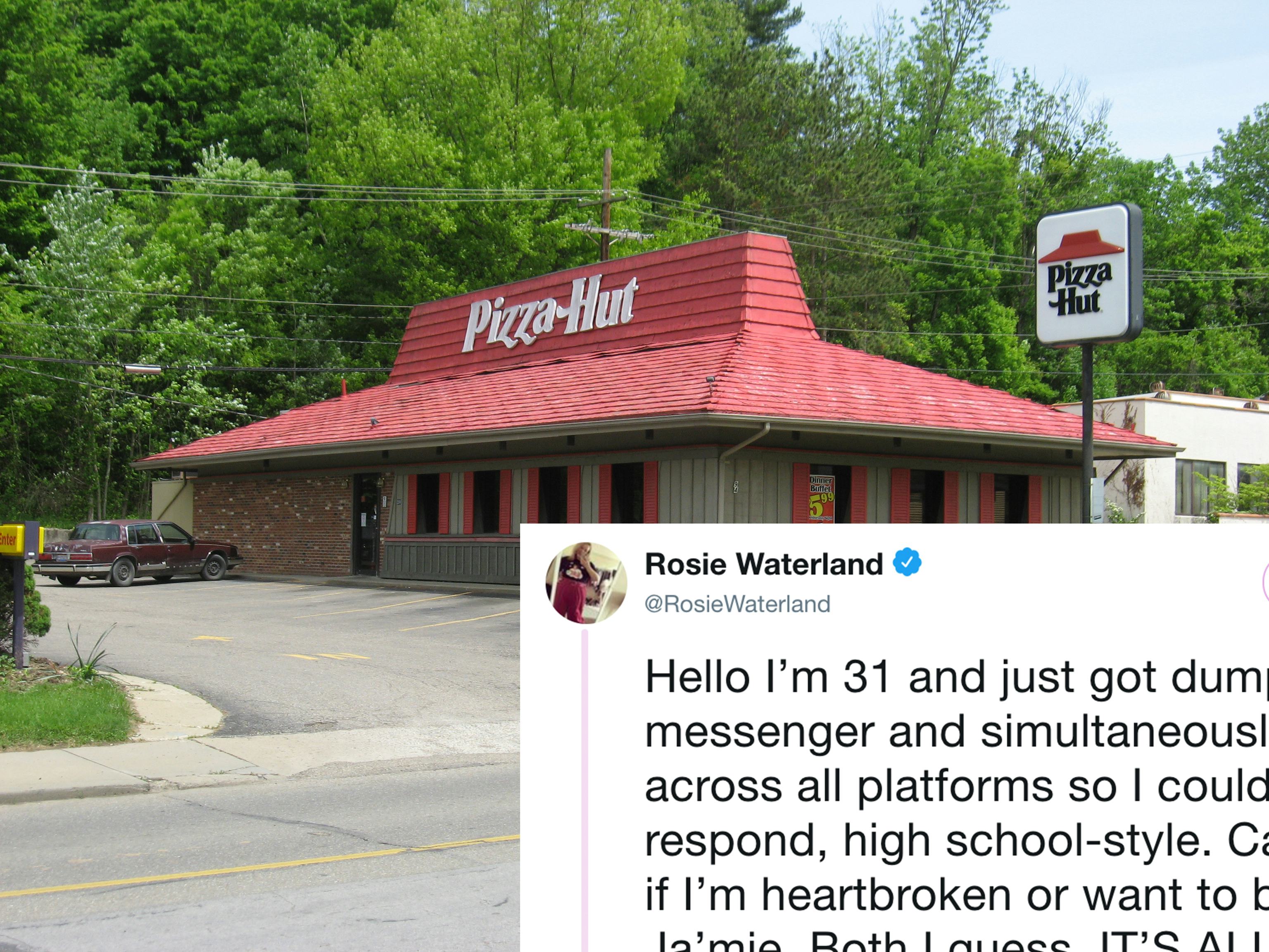 While there may not be one cure-all for heartbreak, I’m pretty sure at least part of the remedy involves pizza. Hopefully such is the case for Australian writer and author Rosie Waterland who was gifted free food by Pizza Hut after tweeting about her break-up. We all need a shoulder to cry on after a heartbreak, and sometimes that shoulder is ... Pizza Hut?