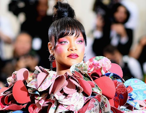 According to a post on the Fenty Beauty Instagram account, Rihanna wore one of her new Foiled Killawatt highlighters to the Met Gala all the way back in 2017. If you remember, the 2017 Met Gala was easily one of the actor and singers most iconic looks. For the fundraising event, the theme honored Commes de Garçon designer Rei Kawakubo, and while many celebrities didn't abide by the theme (though, it's not required), Rihanna was one of the few who did. In fact, she was dressed in one of Kawakubo's own designs for the occasion. While the multi-patterned, structural ensemble was a total show stopper, her makeup was as well. Turns out, it was Fenty Beauty all along.