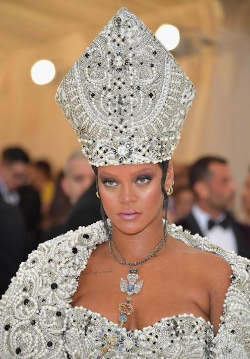 To cap off her avant-garde look, Rihanna wore Cartier jewels, Christian Louboutin heels, and a Pope-like hat to accentuate gown. Her hair was tucked underneath the enormous beaded headpiece, leaving only small tendrils peaking out. Her makeup, which was quite understated for the Fenty Beauty creator, focused on a light smoky eye in grays — and almost no eyebrows to be seen.
