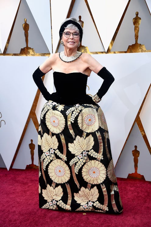 Hollywood legend Rita Moreno hit the 2018 Oscars red carpet wearing a gorgeous gown with a printed skirt, long black gloves, and a headband — but only her biggest fans would know that her dress is actually the same exact thing she wore to the 1962 Oscars. Most surprisingly, the garment looks brand new.
