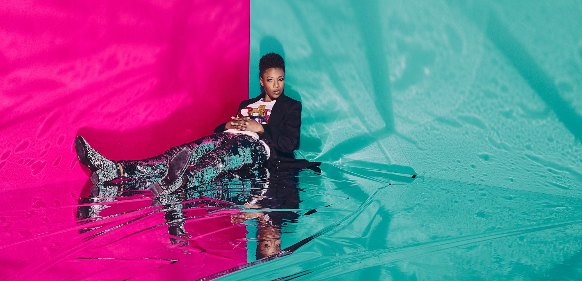 This is how you’re supposed to begin: You’re supposed to say that Samira Wiley is down for whatever. Need her to hang upside down, jump on a box, or lie on the cold concrete floor in sequined Marc Jacobs to get the perfect shot? No problem. The (almost) 31-year-old actor best known for portraying outspoken and resilient women in Netflix’s hit dramedy Orange Is The New Black and Hulu’s award-winning series The Handmaid’s Tale is serving lewks as Bruno Mars pours through the speakers of a trendy studio on Hollywood’s Sunset Boulevard.