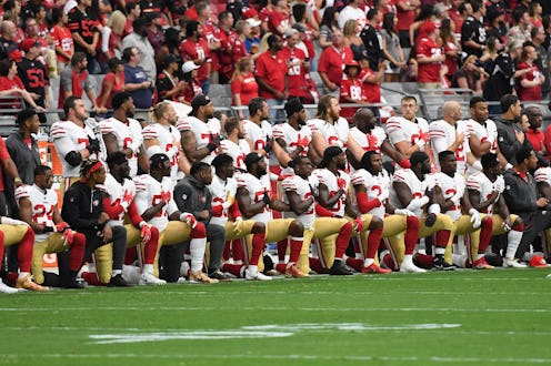 San Francisco 49ers explained their reasoning for the pre-game demonstration said, ""For more than a year, members of our team have protested the oppression and social injustices still present in our society. While some may not have taken a knee or raised a fist, we have shared the desire to influence positive change."