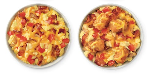 The Crispy Bacon Breakfast Bowl is loaded with bacon, eggs, cheese, grilled onions and diced tomatoes.The Crispy Bacon and Tots Breakfast Bowl also comes with bacon, eggs, cheese, grilled onions, and diced tomatoes. But, crispy, golden tater tots are added to the mix. The sausage-based bowls are similar. They, too, come loaded with eggs, cheese, grilled onions, and diced tomatoes. But, predictably, they swap out bacon for sausage. Sausage bowls are available with or without tater tots.