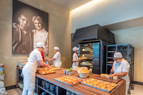 The space revolves around the oven, which is the main attraction and life force of the brand. And, you know, the thing that brings us bread. Like in a traditional bakery, glass food cases display cornetto, brioche, focaccia, ciabatta, pizza and sweets. There's also a few breakfast menu items like steel-cut oats with Italian jam and baked eggs with spicy tomato sauce. For lunch there's soups and salads and sandwiches featuring the different breads. For the evening, there's hot entrees, tarts, cakes and cocktails, beer, wine, and more small plates.
