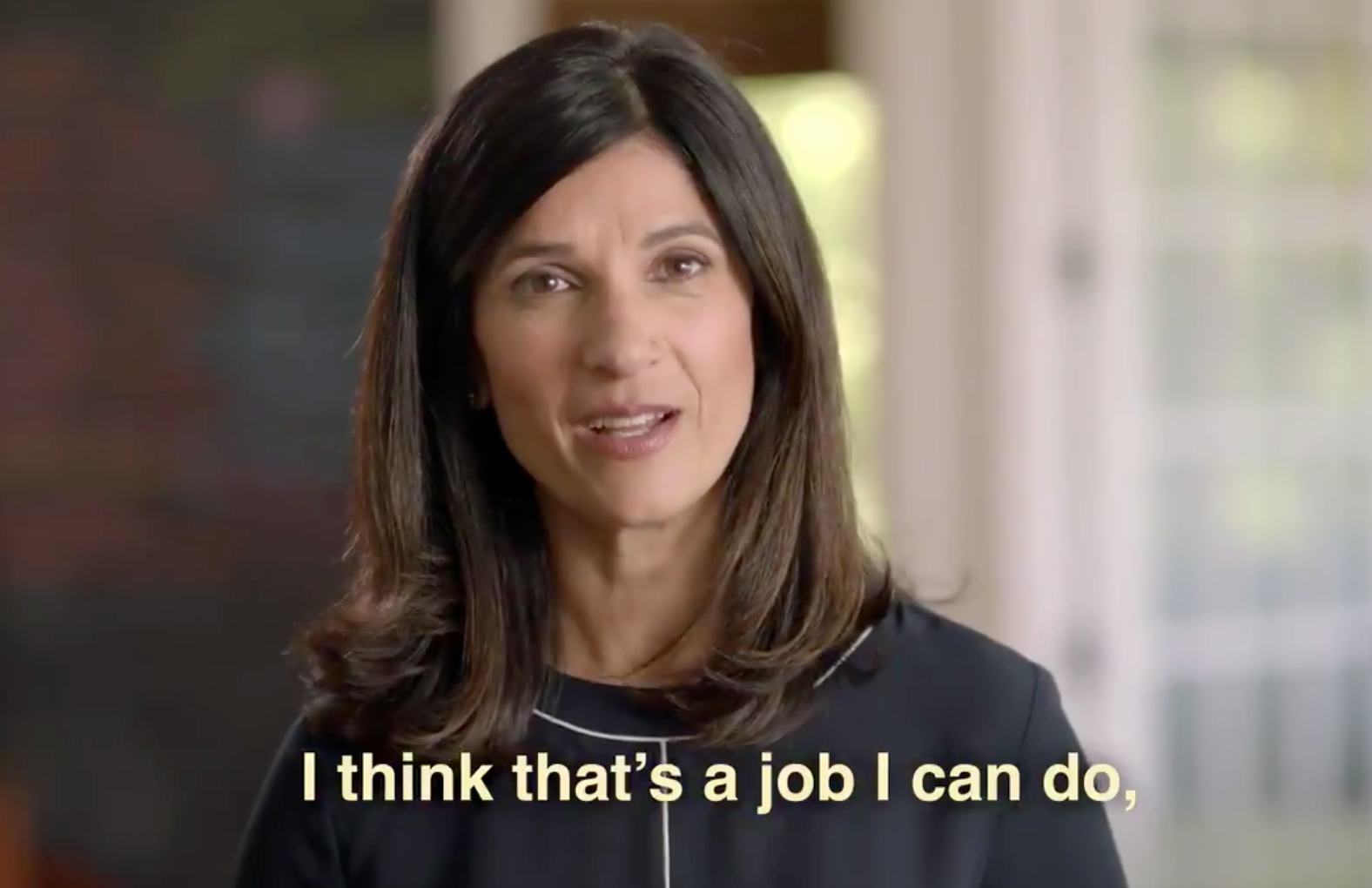 "It all started with one of these," Gideon said as she holds up an answering machine in an ad announcing her campaign. "I pressed that blinking answering machine button and heard a message left for my husband Ben. It said they knew he was probably too busy with work but would he consider running for the town council? I thought to myself, actually, I think that's a job I can do and somewhere I could make a difference, so I ran for that office, and won."