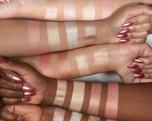 Launching from her brand in April, Kattan didn't specify which of the two $45 highlighter palettes is swatched on which arm in the image below, but the choices are the Pink Sands Palette, ideal for fair to medium skin tones, or the Golden Sands Palette, which glows on medium to dark skin tones. From my careful analysis of the evidence (i.e. looking back and forth at the palettes and swatches at least 13 times), I'm inclined to say that working from top to bottom, we're looking at the Golden Sands, then the Pink Sands on fair skin, Pink then Golden on the medium, and Golden, then Pink on the darker.